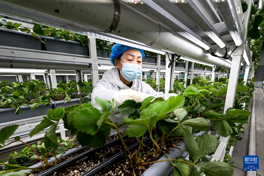 2月28日,在位于回民区的内蒙古宇生乐谷丰现代农业产业园的植物工厂,工作人员在管护草莓植株。