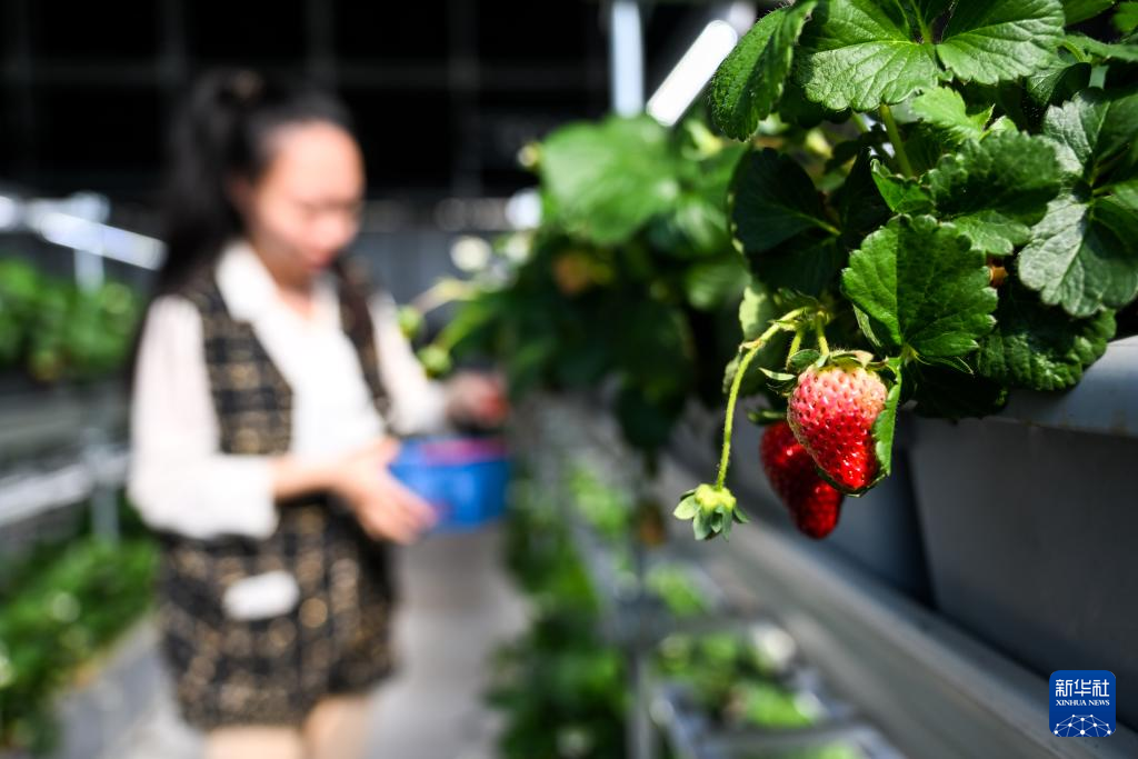 2月28日,在位于回民区的内蒙古宇生乐谷丰现代农业产业园的植物工厂,游客在采摘草莓。