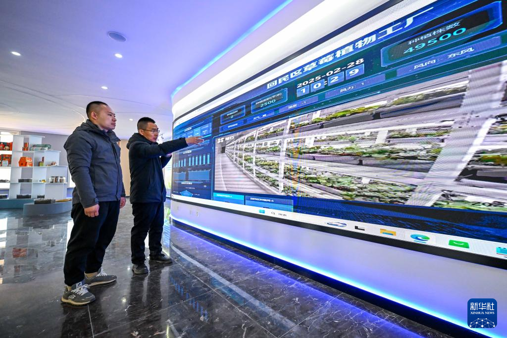 2月28日,在位于回民区的内蒙古宇生乐谷丰现代农业产业园的植物工厂,工作人员通过监控系统查看厂房内的生产情况。