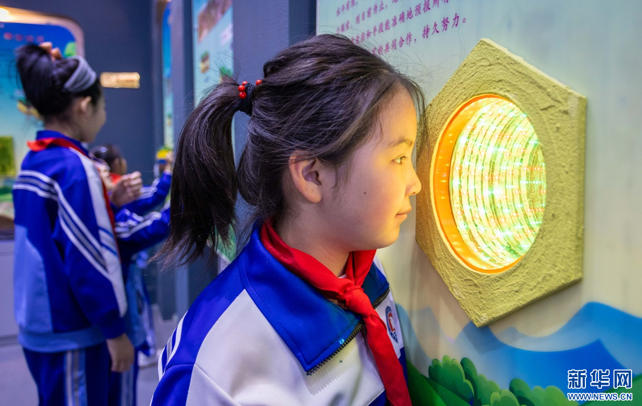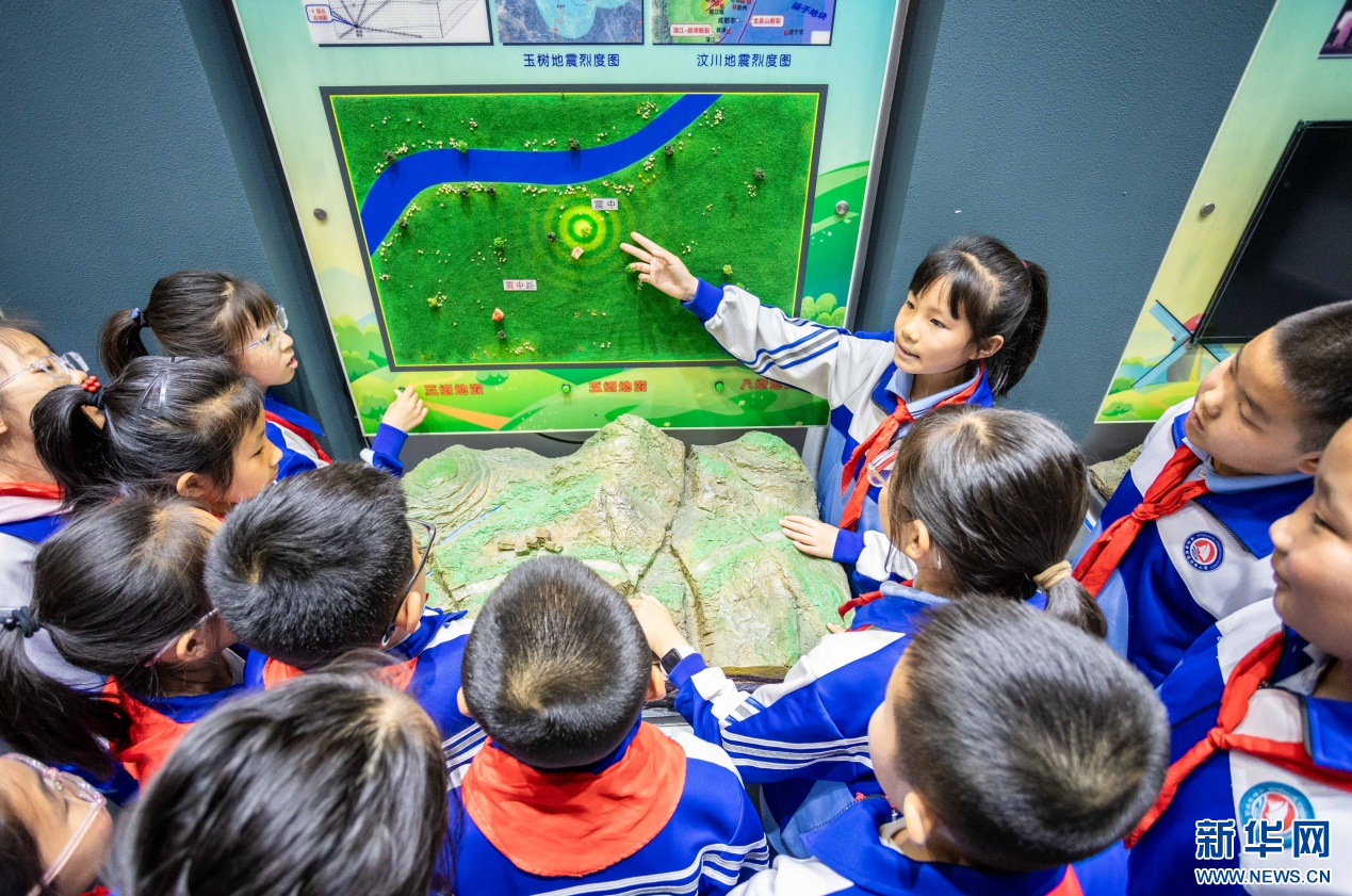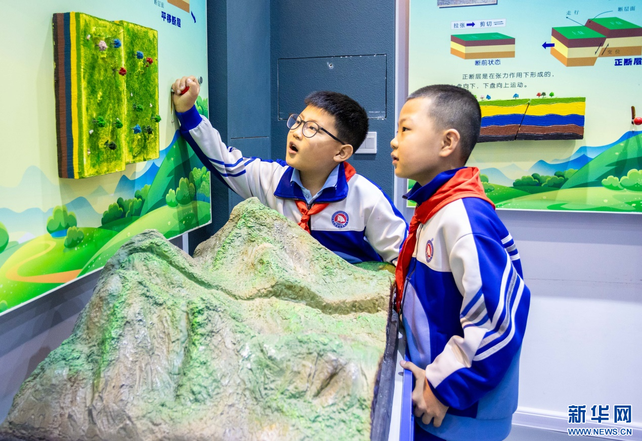 5月8日,呼和浩特市玉泉区通顺街小学学生在地震科普馆里通过模型了解地震前兆知识。新华网发(丁根厚 摄)