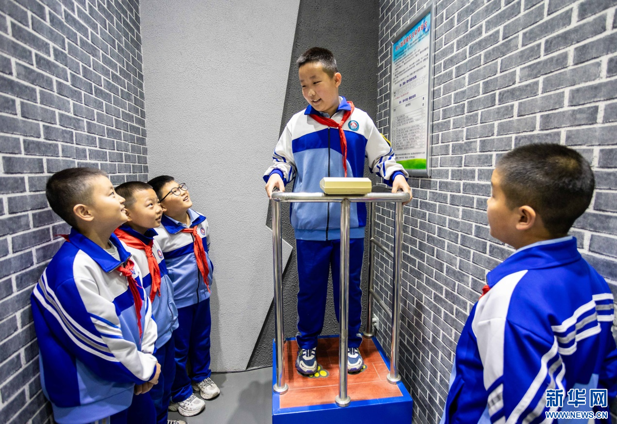 5月8日,呼和浩特市玉泉区通顺街小学学生在地震科普馆内体验“地震小屋”。新华网发(丁根厚 摄)
