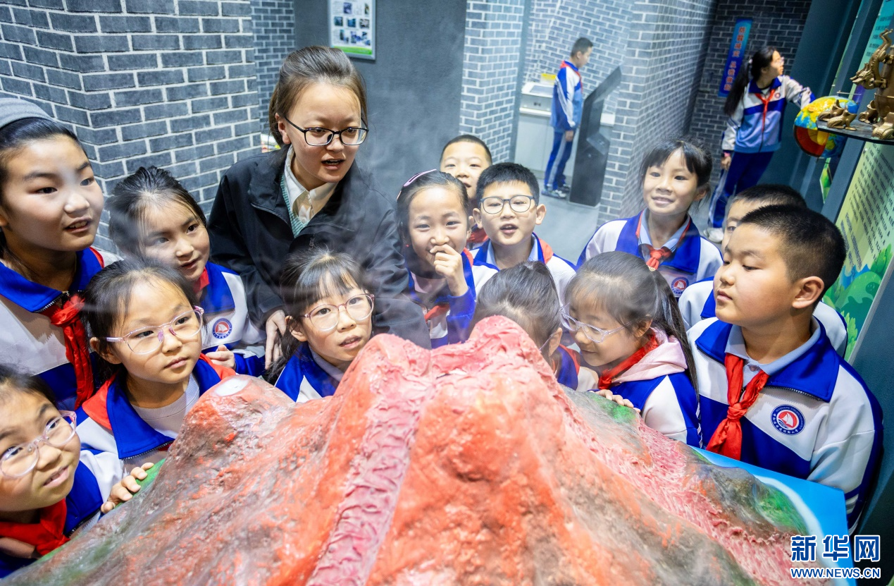 5月8日,呼和浩特市玉泉区通顺街小学学生在地震科普馆通过演示装置了解火山喷发知识。新华网发(丁根厚 摄)