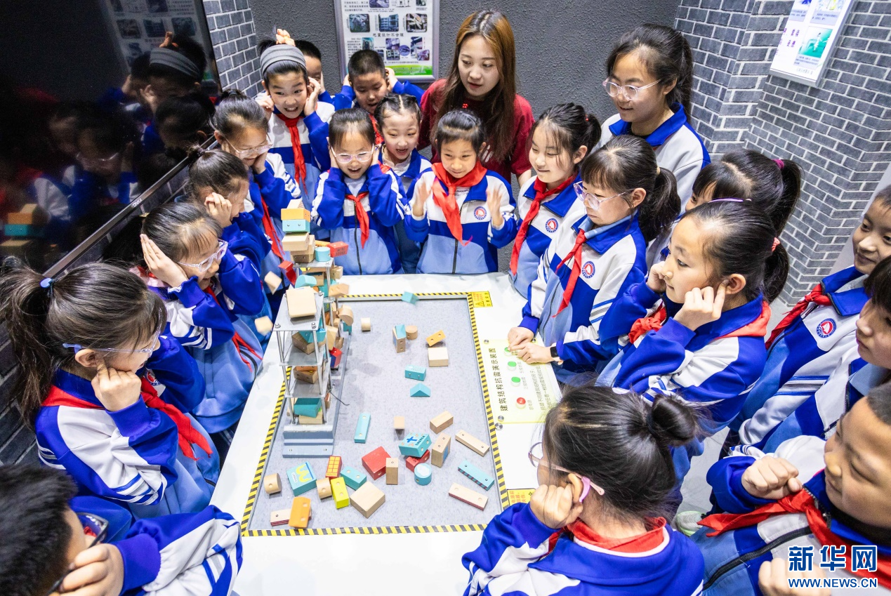 5月8日,呼和浩特市玉泉区通顺街小学学生在地震科普馆通过演示装置了解建筑结构抗震知识。新华网发(丁根厚 摄)