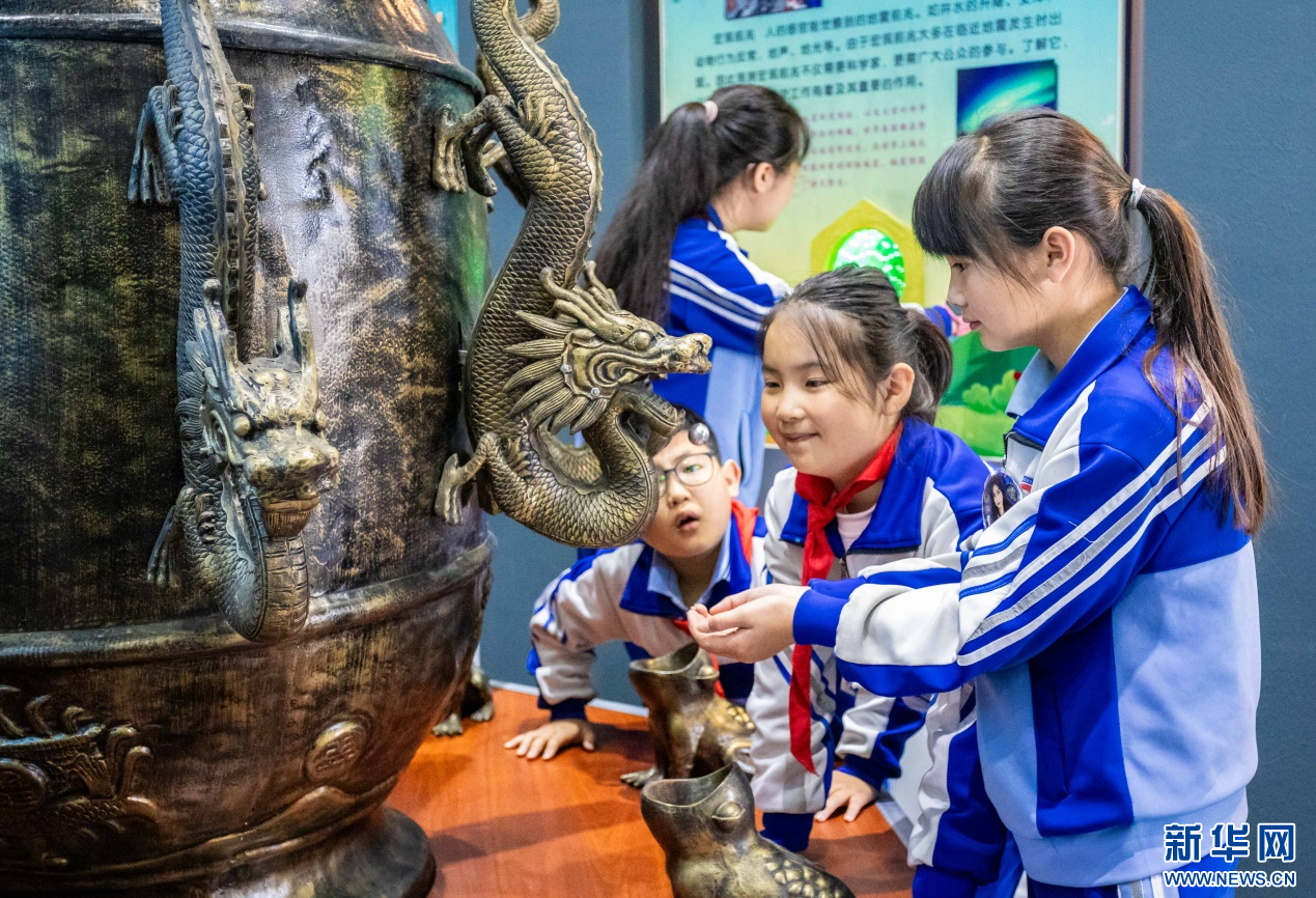 5月8日,呼和浩特市玉泉区通顺街小学学生在地震科普馆了解张衡地动仪模型的工作原理。新华网发(丁根厚 摄)