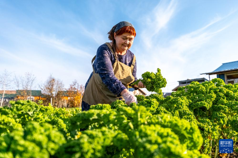 9月26日,在内蒙古呼伦贝尔市额尔古纳市恩和俄罗斯族民族乡,孙运梅在菜园里采摘制作沙拉用的羽衣甘蓝。