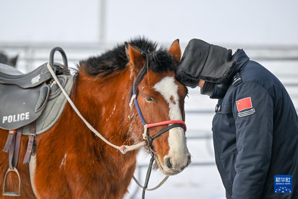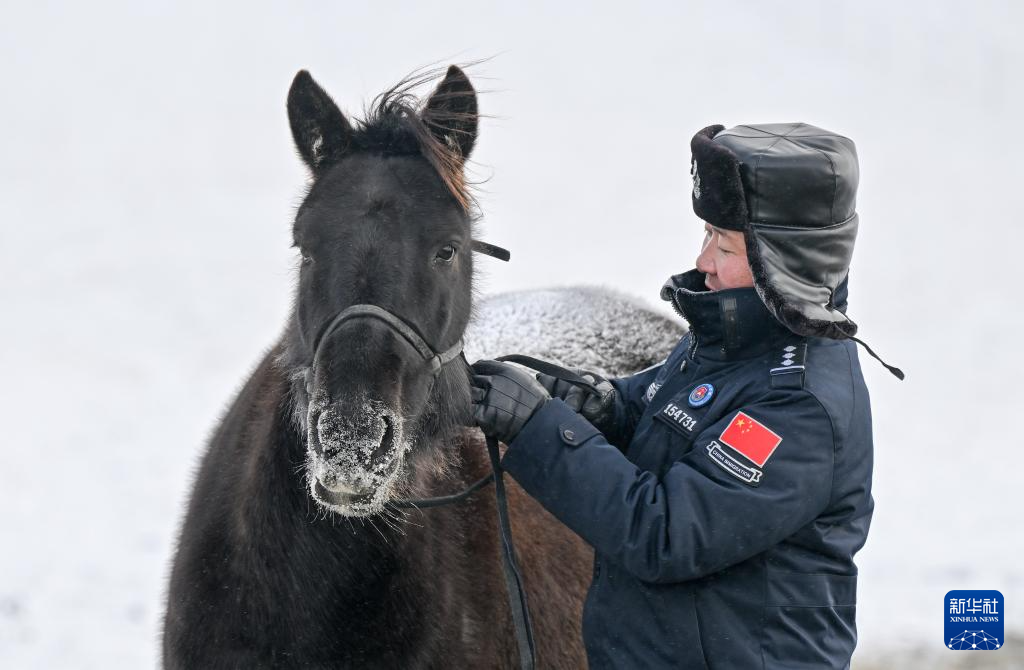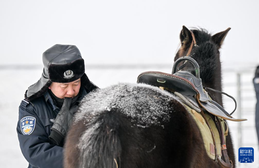 2024年12月27日,马背警队民警赛音白乙拉给马套上笼头。新华社记者 连振 摄