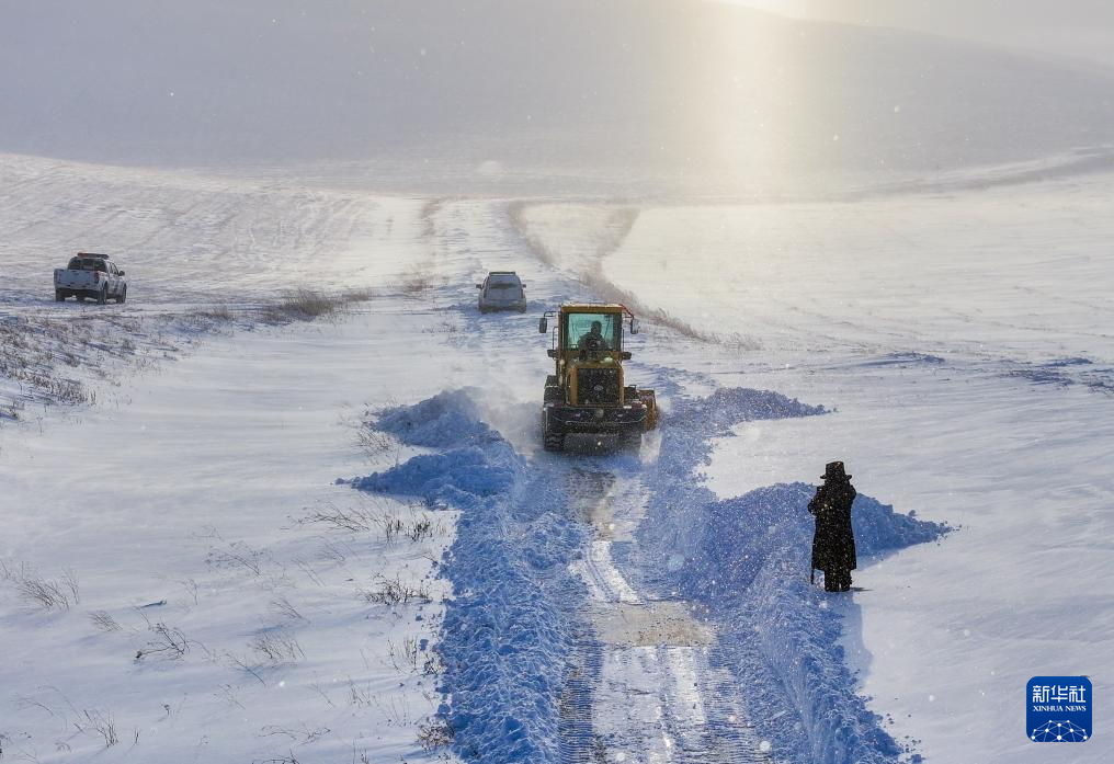 2024年12月27日,马背警队和舍伯尔图边境派出所的民警协调铲车,为受困群众铲雪通路(无人机照片)。新华社记者 连振 摄