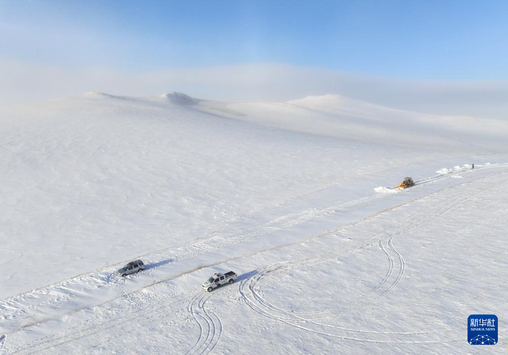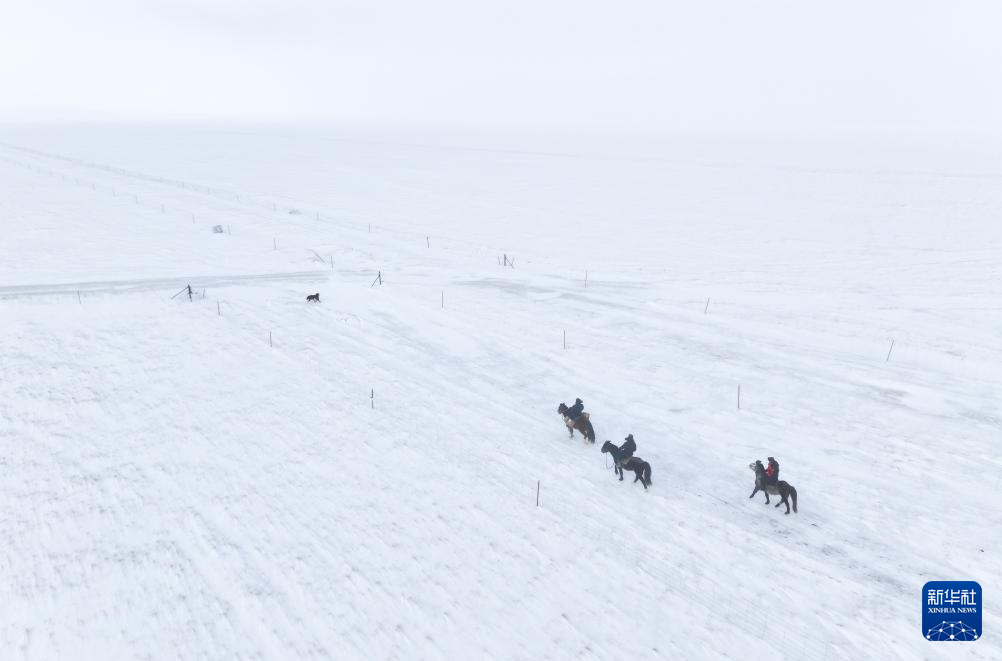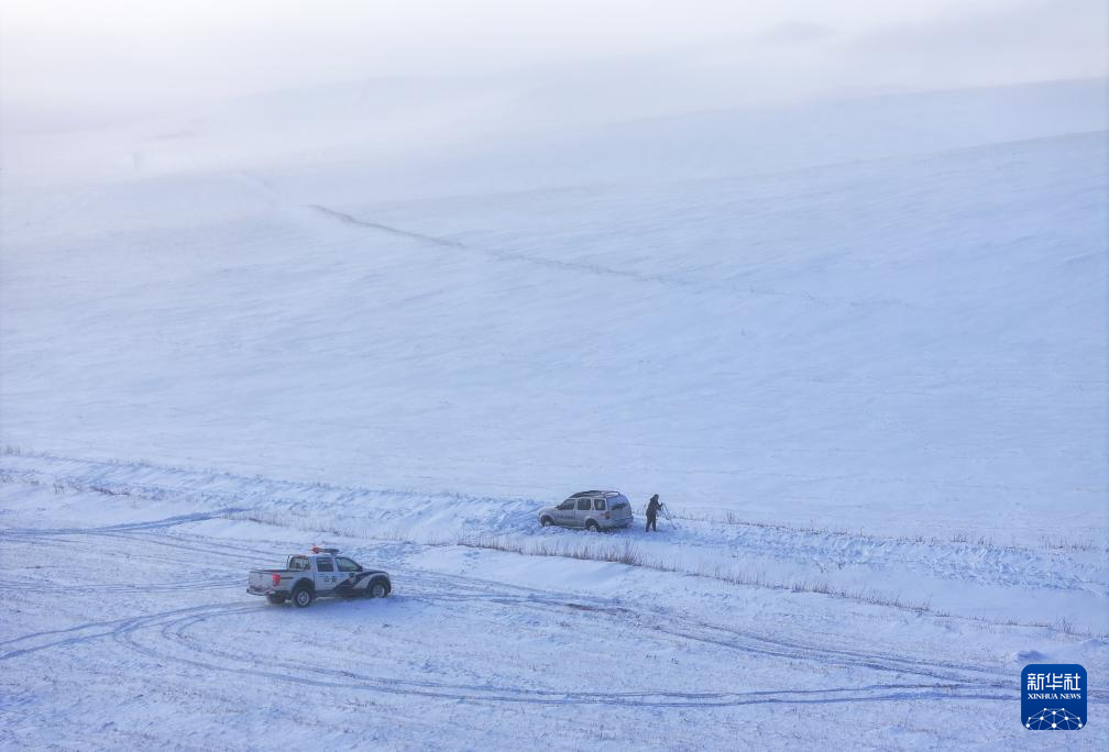 2024年12月27日,接到群众求助后,马背警队和舍伯尔图边境派出所的民警第一时间来到群众受困地点(无人机照片)。新华社记者 连振 摄
