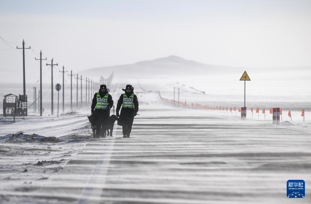 2025年1月8日,马背警队的民警张柏何(左)和陈子渊在检查站执勤。新华社记者 连振 摄