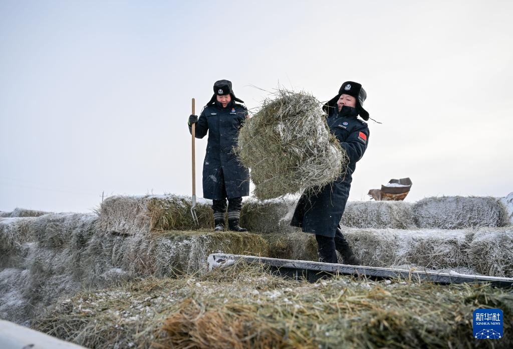 2024年12月27日,马背警队的民警们准备给马匹饲喂草料。新华社记者 连振 摄