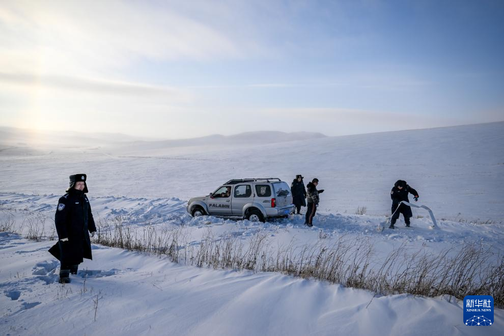 2024年12月27日,马背警队和舍伯尔图边境派出所的民警为受困群众车辆绑上拖车绳。新华社记者 连振 摄