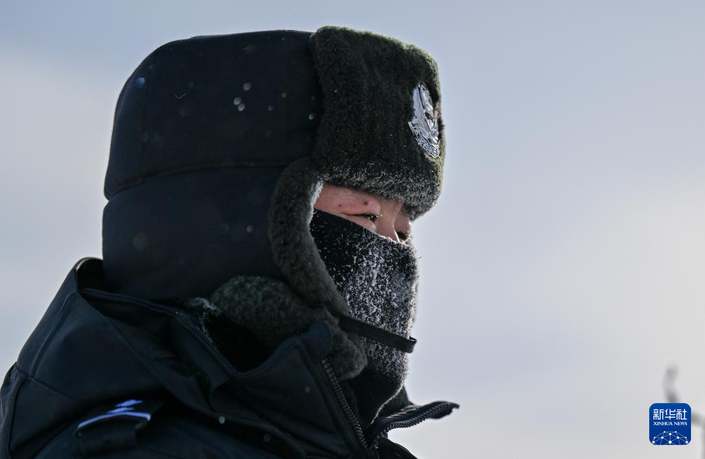 2025年1月8日,民警姚明明的面罩上结满了冰霜。新华社记者 连振 摄