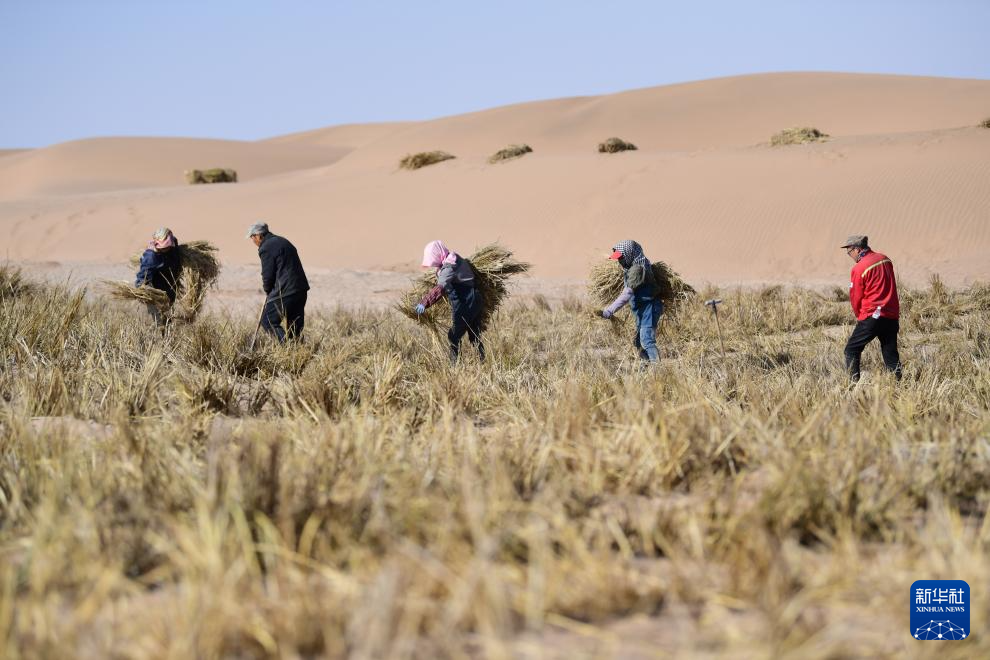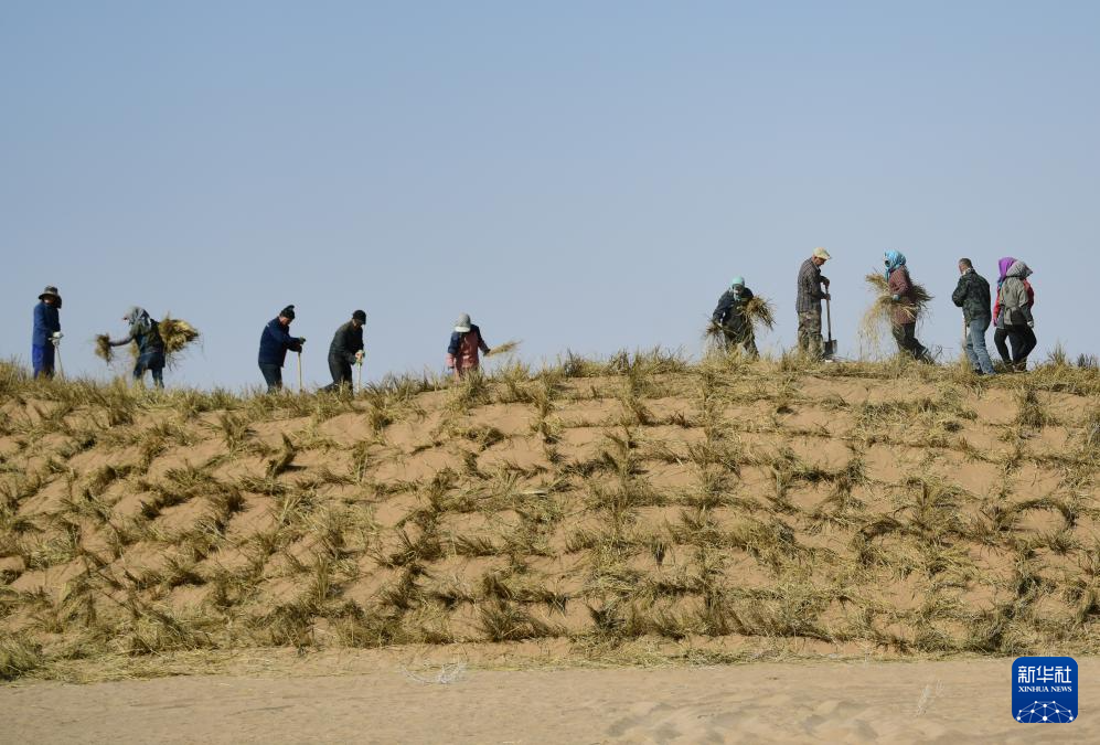 2月28日,在巴丹吉林和腾格里两大沙漠交汇处的阿拉善九棵树项目区,治沙工人用稻草在沙漠中扎草方格。