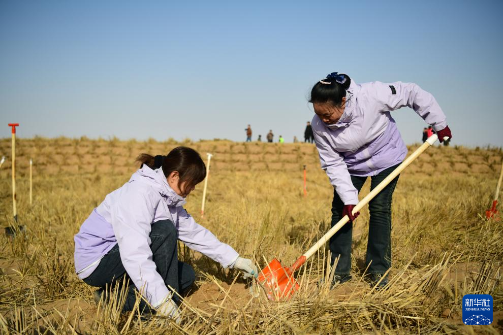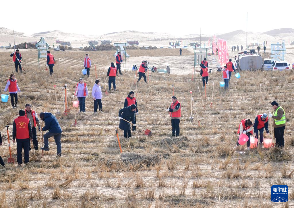 2月28日,在巴丹吉林和腾格里两大沙漠交汇处的阿拉善九棵树项目区,干部群众在沙漠中种植梭梭。