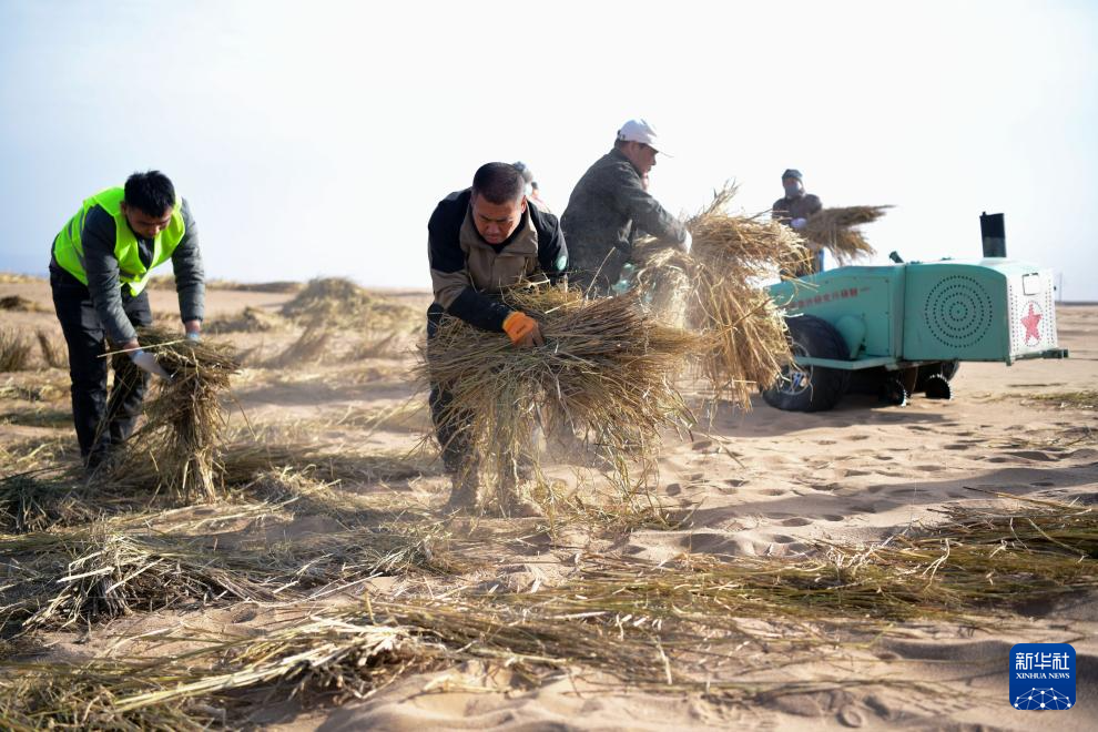 2月28日,在巴丹吉林和腾格里两大沙漠交汇处的阿拉善九棵树项目区,治沙工人在用稻草扎草方格。