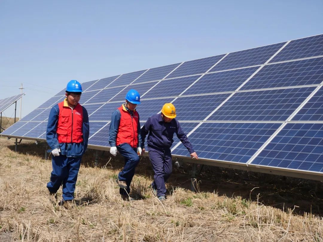 4月19日,国网蒙东电力公司蒙古马(库伦运维检修)共产党员服务队在库伦旗协力光伏有限公司巡检集中式光伏电站。王岩 贾锟 摄