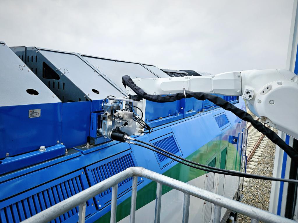 自动加氢机器人最大加氢流量为每分钟7.2千克,最快30分钟可加满一台氢能动力机车,所加注的氢燃料可供机车连续运行8小时。