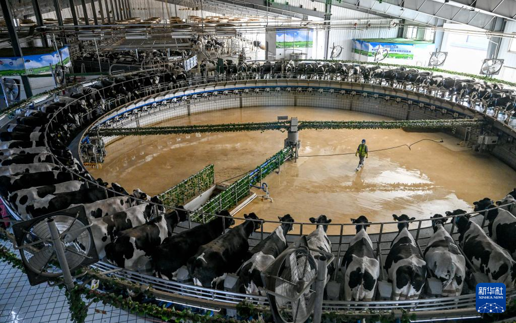 这是在呼和浩特市土默特左旗伊利敕勒川生态智慧牧场拍摄的挤奶中的奶牛。新华社记者 连振 摄