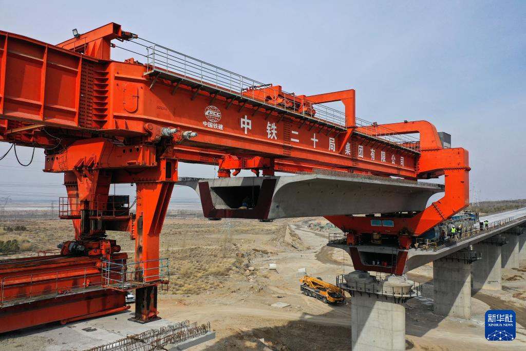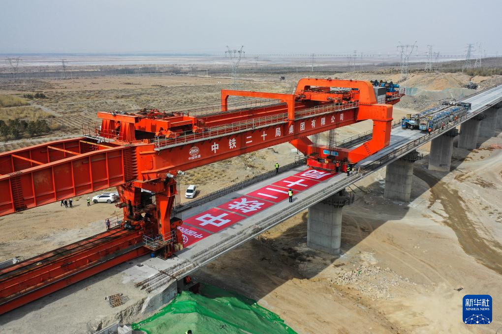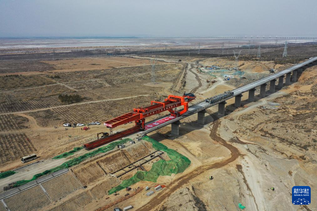 这是3月6日拍摄的包银高铁河源村特大桥合龙施工现场(无人机照片)。新华社记者 李志鹏 摄