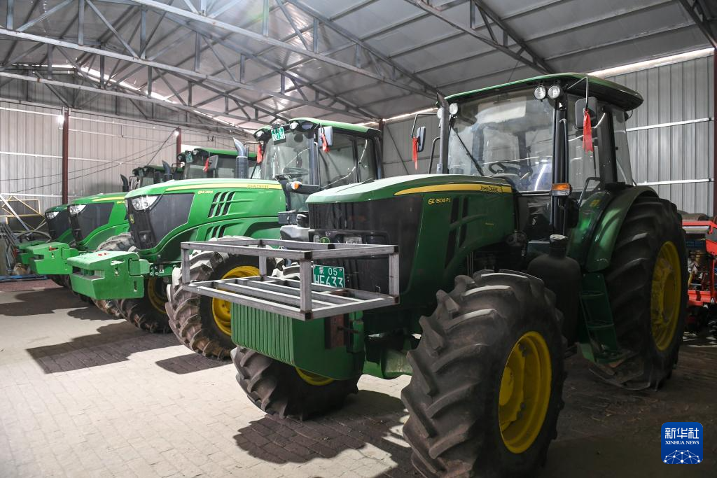 两台崭新的拖拉机仅车轱辘就一人多高。陈胡日查说,这种拖拉机省油、效率高,一天能种300多亩地。