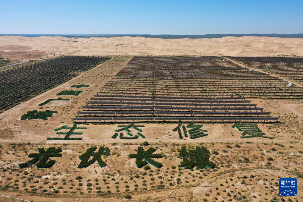 昔日“黄沙遮天日,飞鸟无栖树”的沙海中,一块块亮晶晶的蓝色光伏板串连在一起,在沙漠北缘正构筑起一道一望无际的“光伏长城”,成为当地生态治理、经济发展的坚实屏障。
