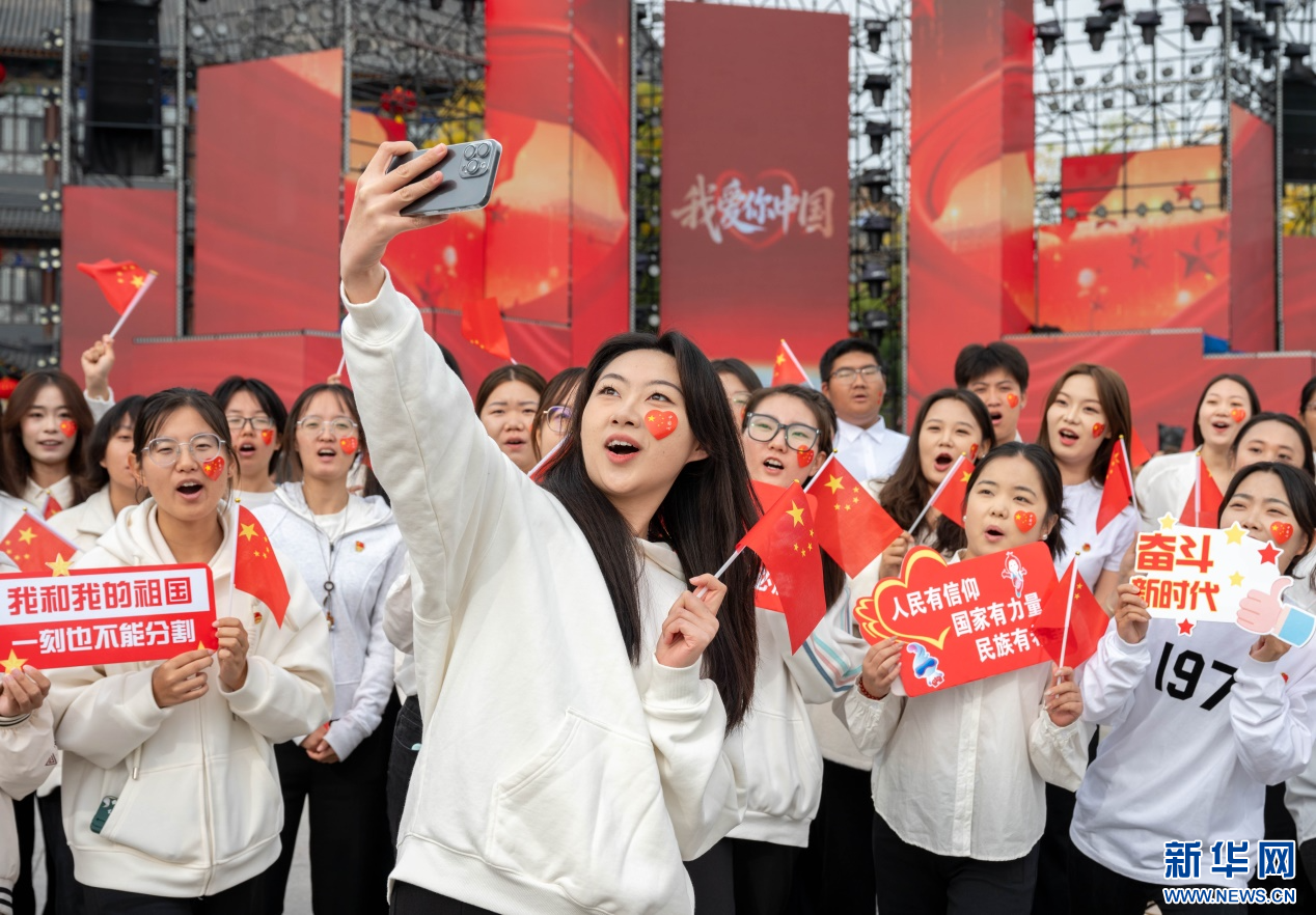 10月1日,内蒙古师范大学马克思主义学院的学子们参加“行走的思政课”快闪活动,祝福伟大祖国繁荣昌盛。新华网发(丁根厚 摄)