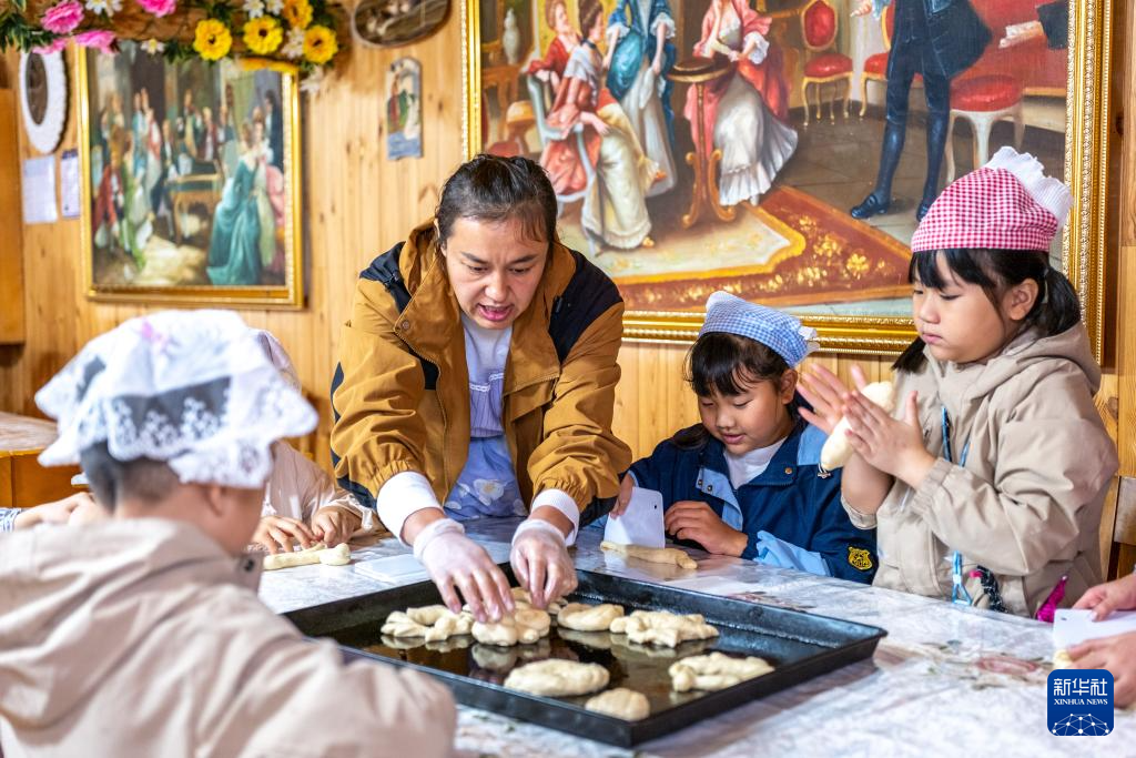8月21日,在内蒙古恩和俄罗斯族民族乡,小朋友在体验制作列巴。