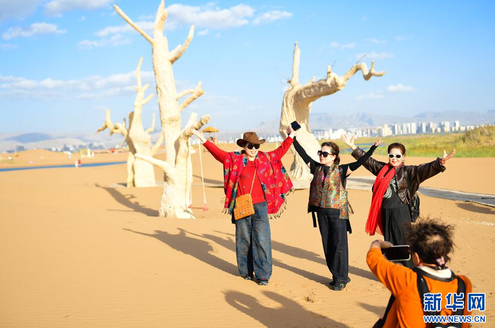 9月23日,游客在乌海湖旅游景区网红打卡点拍照。(康文魁 摄)