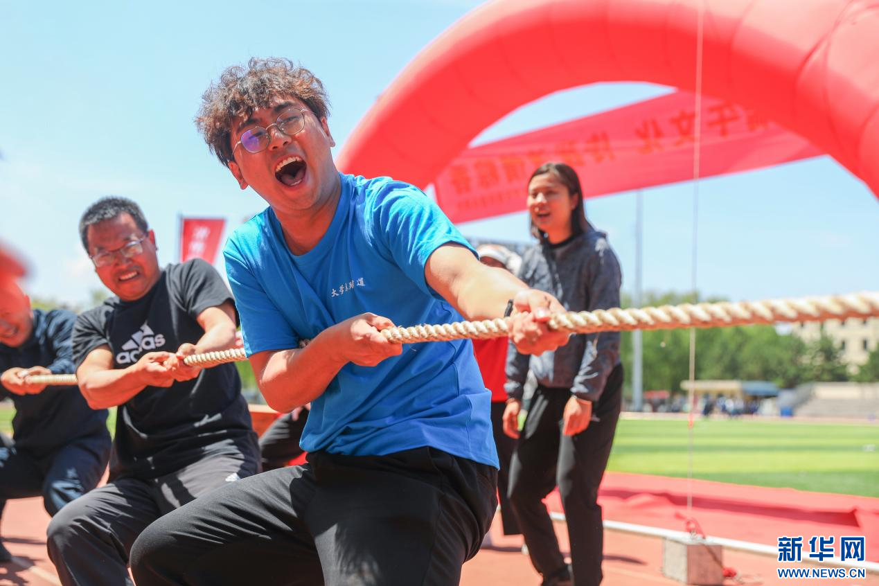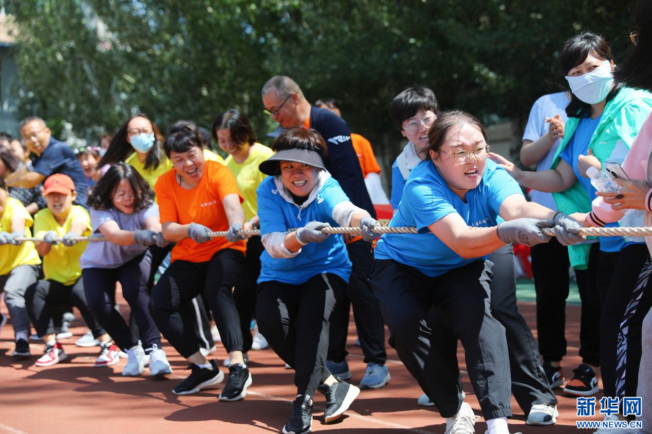 6月7日,呼和浩特市赛罕区大学东路街道社区居民在端午节趣味运动会拔河比赛中。新华网发(李颖剑 摄)