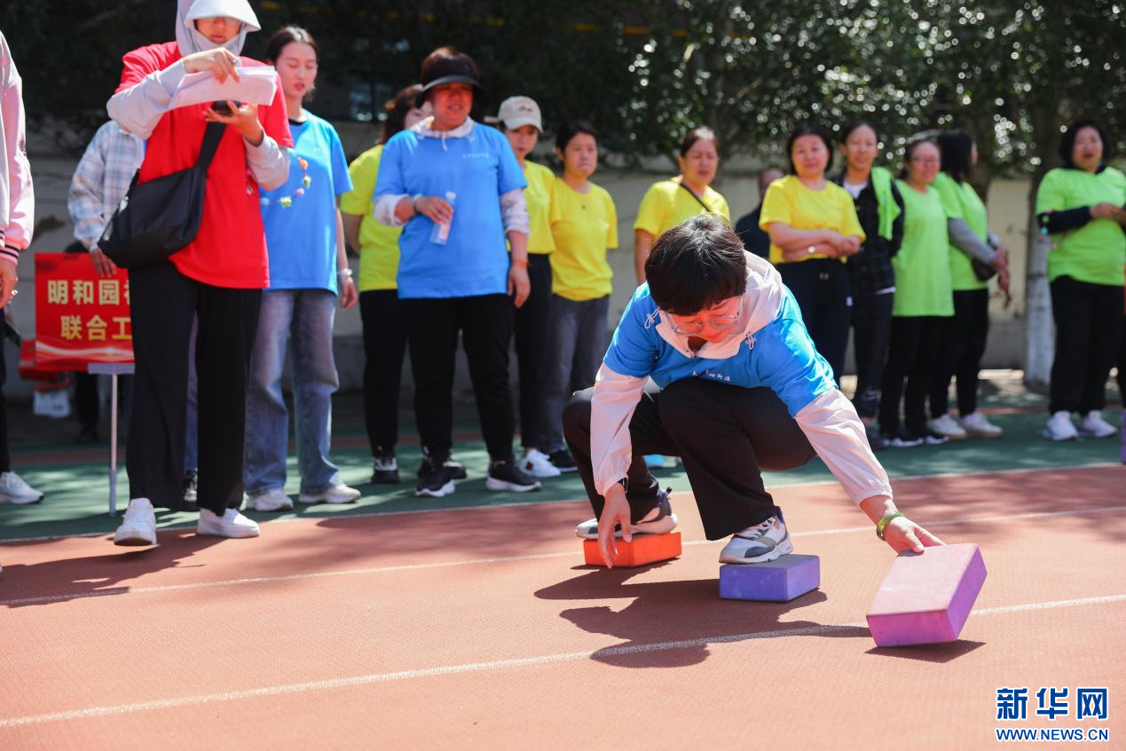 6月7日,呼和浩特市赛罕区大学东路街道社区居民在端午节趣味运动会“摸石过河”比赛中。新华网发(李颖剑 摄)