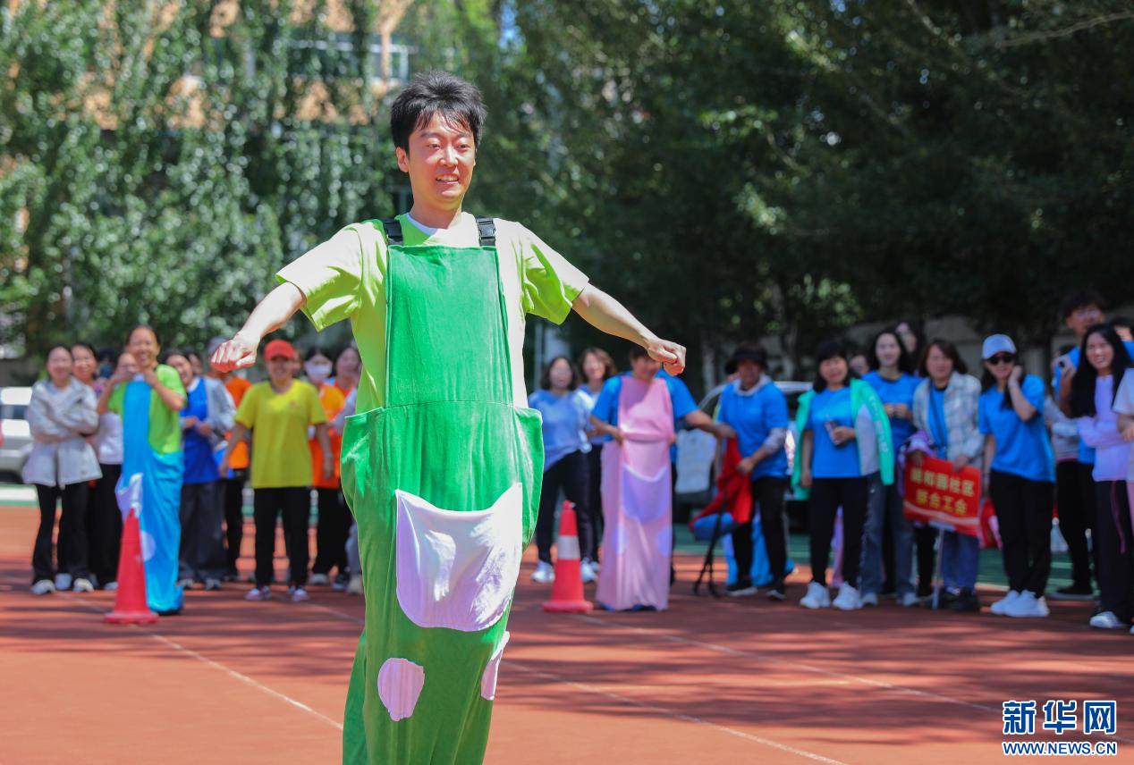 6月7日,呼和浩特市赛罕区大学东路街道社区居民在端午节趣味运动会“袋鼠赛跑”比赛中。新华网发(李颖剑 摄)