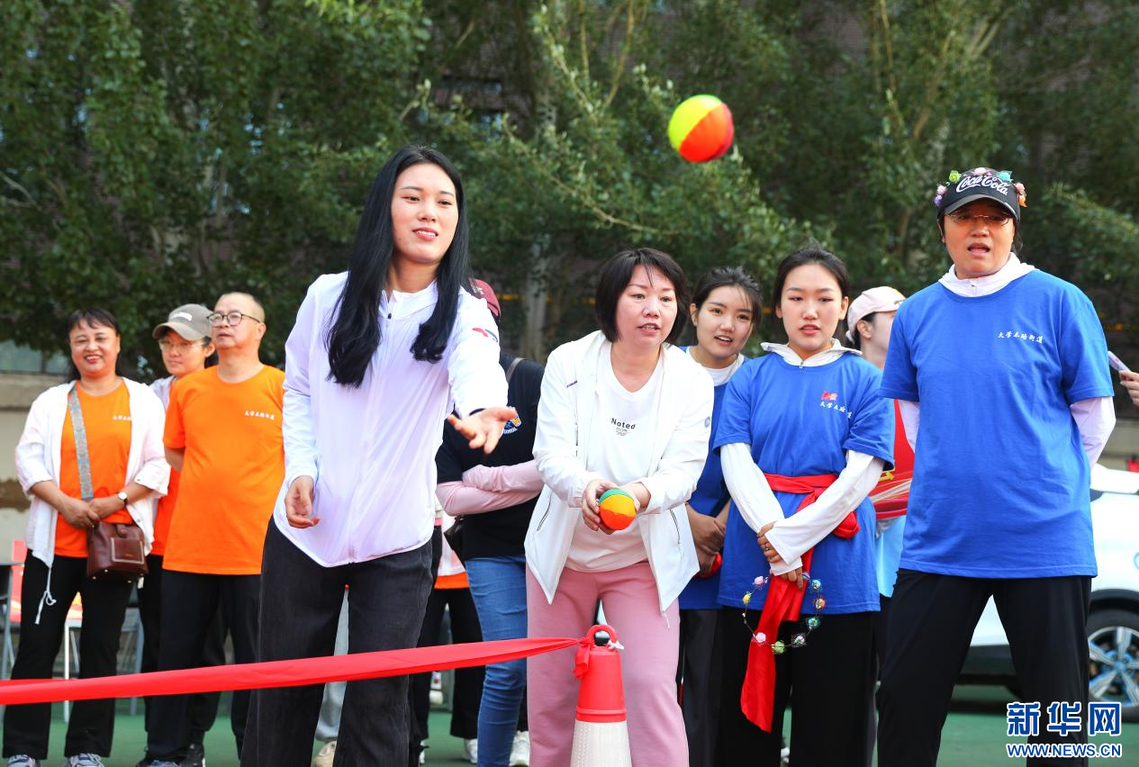 6月7日,呼和浩特市赛罕区大学东路街道社区居民在端午节趣味运动会“投壶”比赛中。新华网发(李颖剑 摄)