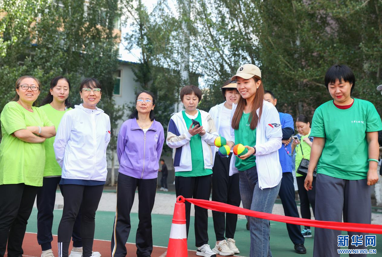 6月7日,呼和浩特市赛罕区大学东路街道社区居民在端午节趣味运动会“投壶”比赛中。新华网发 (李颖剑 摄)