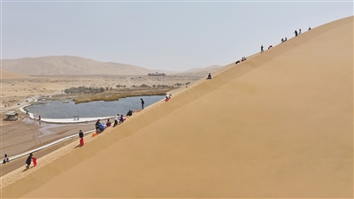 来自全国各地的游客在巴丹吉林沙漠中游玩。记者刘宏章摄