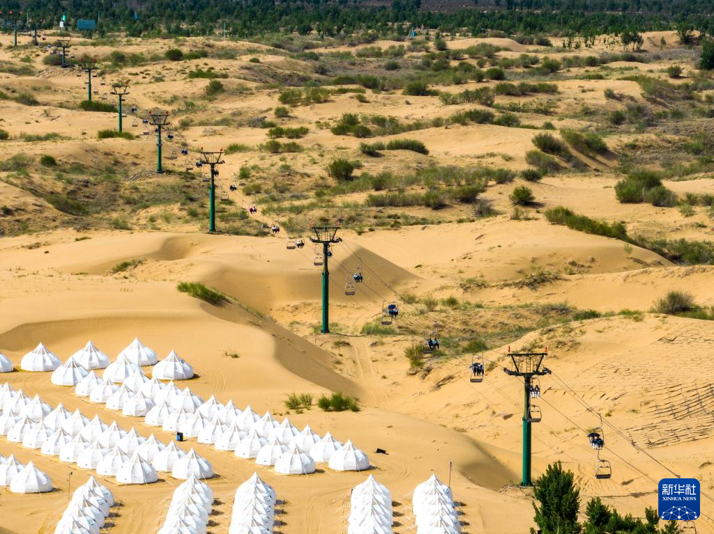 5月31日,在内蒙古自治区鄂尔多斯市达拉特旗境内库布其沙漠中的银肯塔拉景区,游客在乘缆车游玩。(无人机照片)cicphoto/柴军委 摄