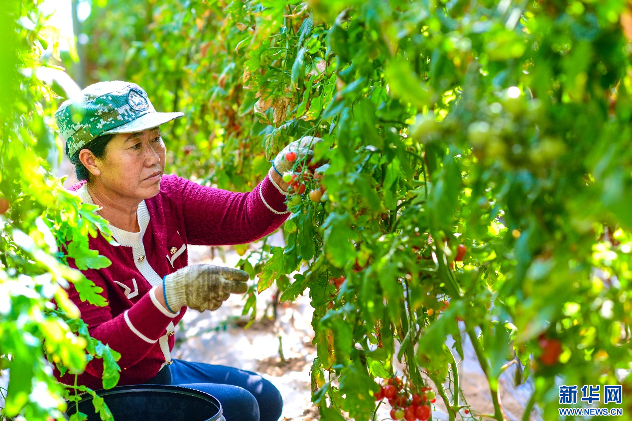 农民在鄂尔多斯市准格尔旗十二连城乡三十顷地村的温室大棚里采收草莓西红柿。新华网发(王正 摄)