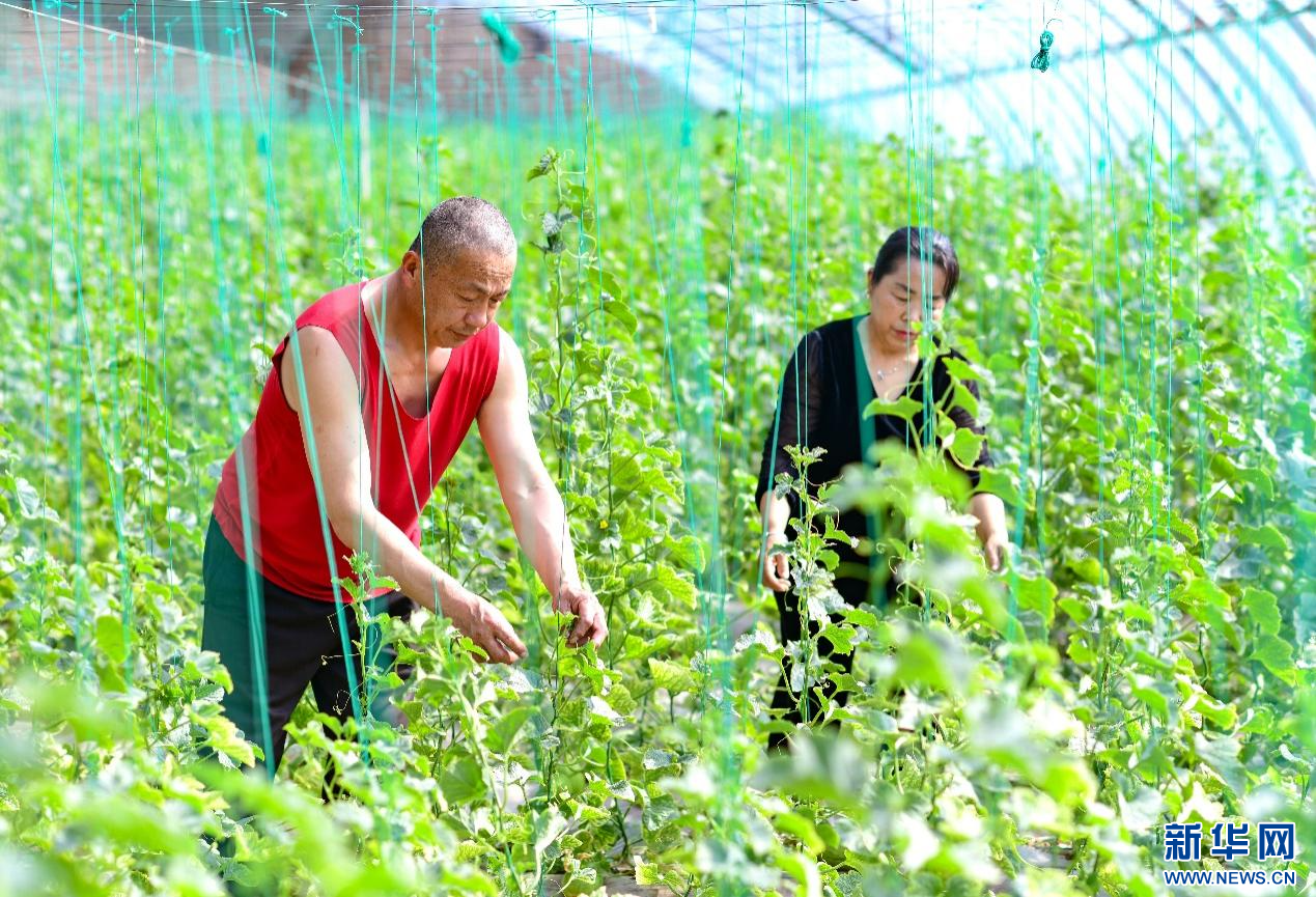 农民在鄂尔多斯市准格尔旗十二连城乡三十顷地村的温室大棚里管护香瓜秧。新华网发(王正 摄)