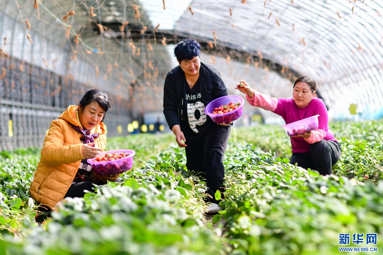 农民在鄂尔多斯市准格尔旗十二连城乡五家尧村的温室大棚里采收草莓。新华网发(王正 摄)