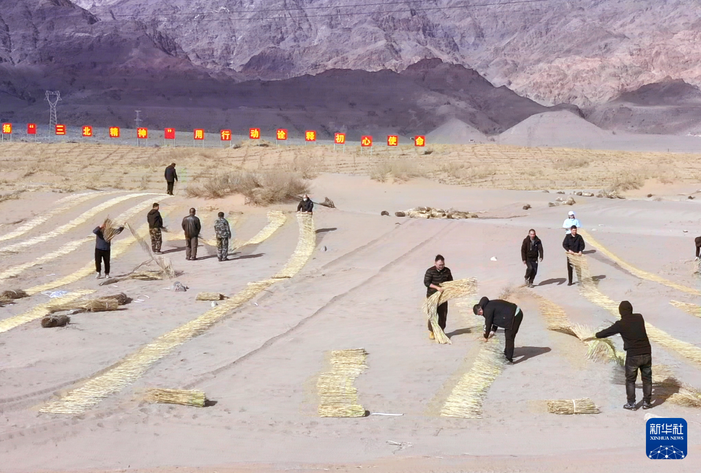 连日来,在巴彦淖尔市乌拉特后旗西补隆林业管护中心未治理沙地中,工人们一边铺芦苇,一边用铁锹压制沙障。该管护中心主任杜永军说:“我们先用长度为60厘米到80厘米的芦苇压制草方格,固定流沙,然后在其中种植灌木,最终实现治理沙地的目的。”