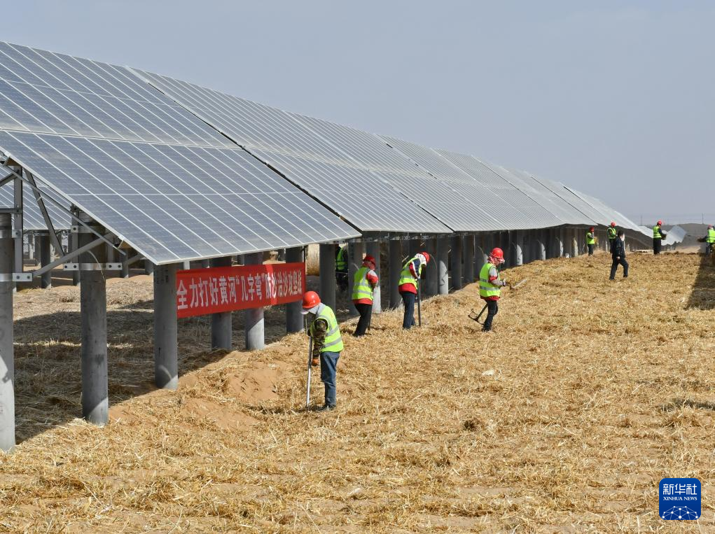 与此同时,巴彦淖尔市磴口县乌兰布和沙漠光伏治沙基地呈现一派繁忙景象。在绵延数公里的光伏板下,工人们有的铺秸秆、压沙障,有的操作沙障铺设机将秸秆嵌入沙地,用一个个草方格锁住流沙。磴口县防沙治沙局局长吴彦杰说:“现在,我们加快实施黄河‘几字弯’攻坚战,重点推进乌兰布和沙漠防沙治沙项目,率先开工生物固沙、退化湿地修复、退化林修复、风电光伏一体化工程,确保在10月底前全面完成建设任务。”