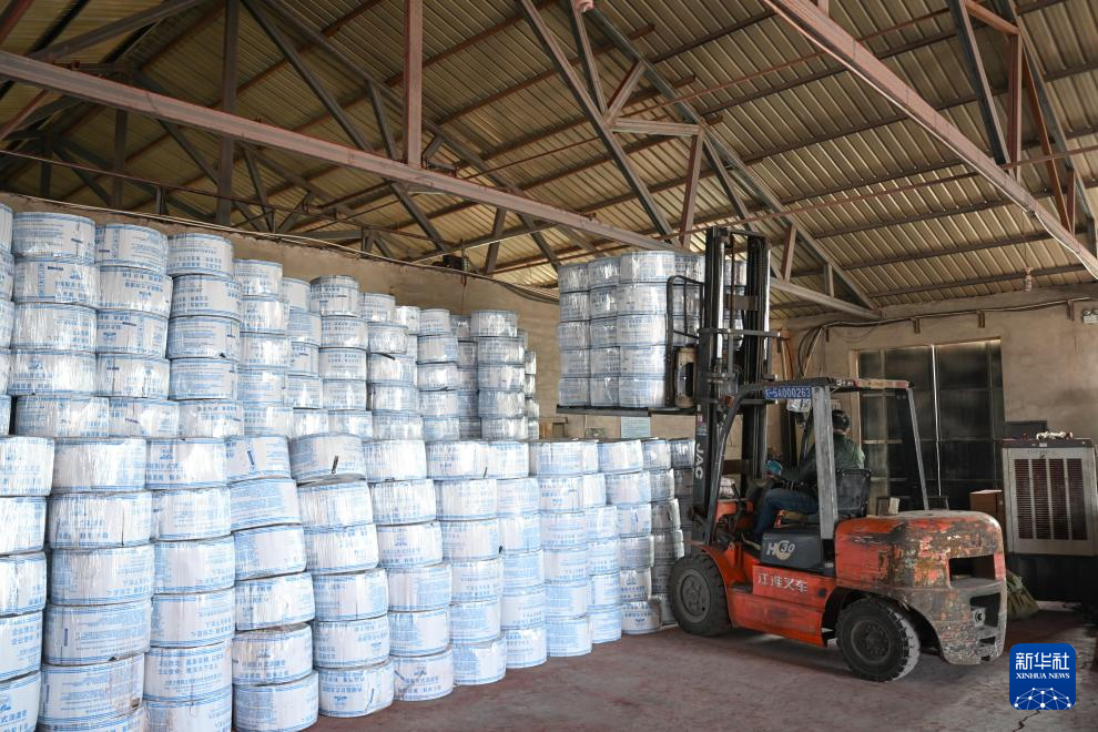3月8日,工人驾驶叉车在内蒙古兴安盟扎赉特旗内蒙古鑫嘉立铭新材料科技有限公司运输滴灌带成品。新华社记者 贝赫 摄