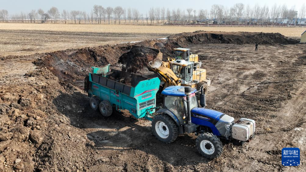 3月8日,农民驾驶农机在内蒙古兴安盟扎赉特旗音德尔镇巨宝村一处农田中装运有机肥(无人机照片)。新华社记者 贝赫 摄