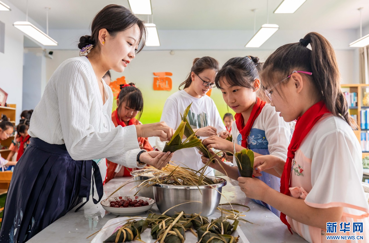6月6日,呼和浩特市玉泉区通顺街小学师生在“我们的节日·端午”主题活动上包粽子。新华网发(丁根厚 摄)