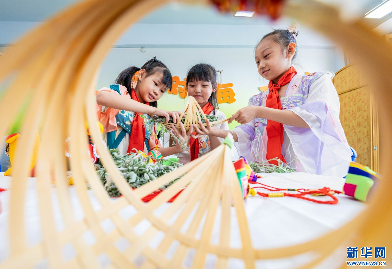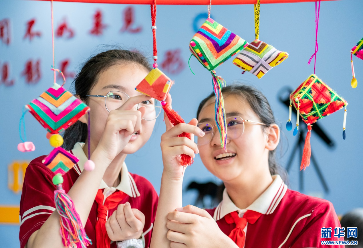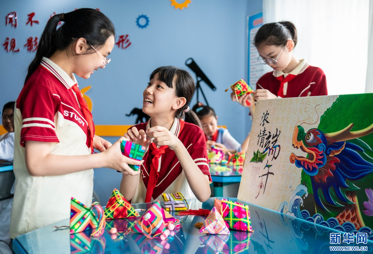 6月4日,呼和浩特市玉泉区恒昌店巷小学学生在体验制作“七彩粽子”香囊。新华网发(丁根厚 摄)