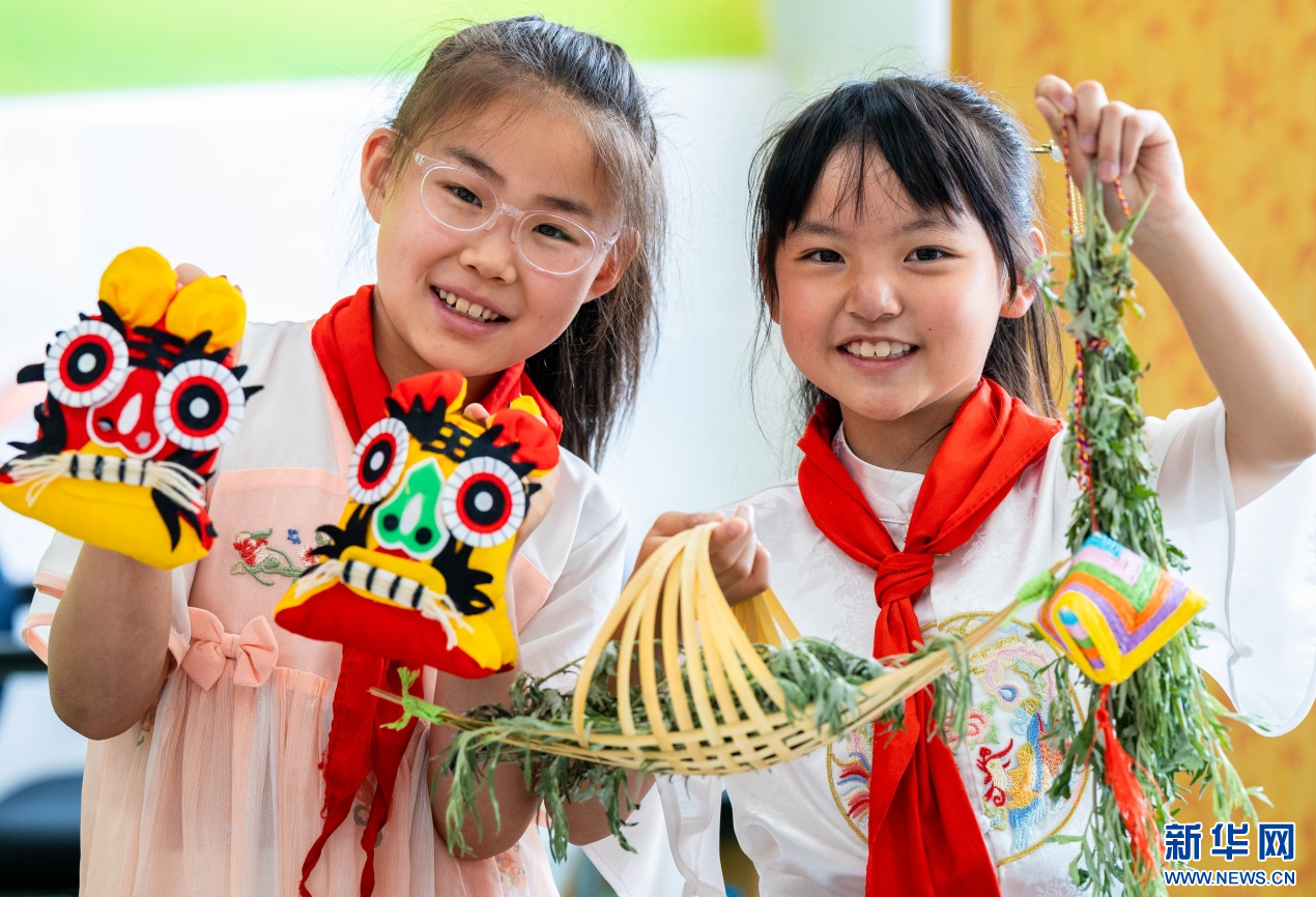 6月6日,呼和浩特市玉泉区通顺街小学学生在“我们的节日·端午”主题活动上展示布老虎、香囊和装有艾草的竹船。新华网发(丁根厚 摄)