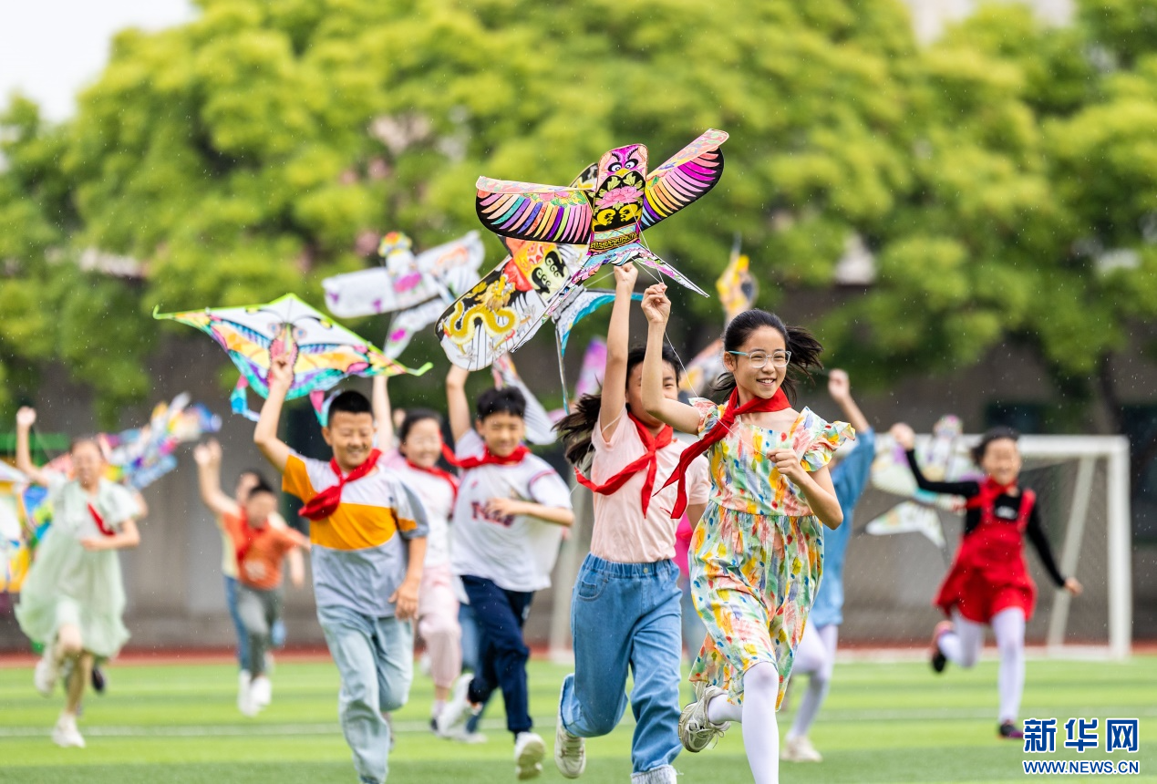 6月6日,呼和浩特市玉泉区五塔寺东街小学学生在“我们的节日·端午”主题活动上放飞纸鸢。新华网发(丁根厚 摄)