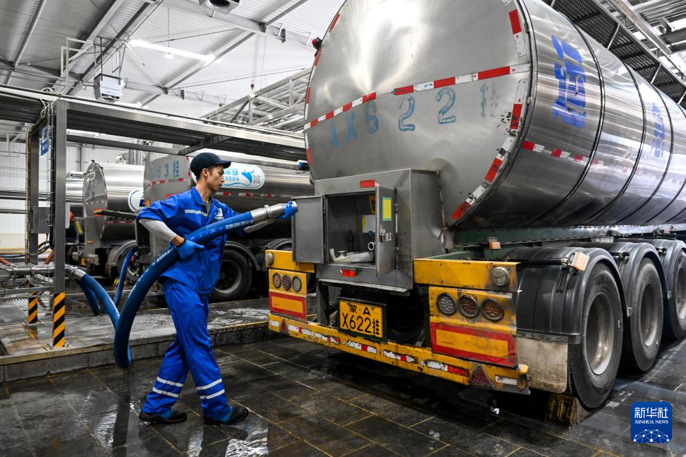 呼和浩特市伊利现代智慧健康谷液态奶全球智造标杆基地,工人在进行收奶作业(7月28日摄)。