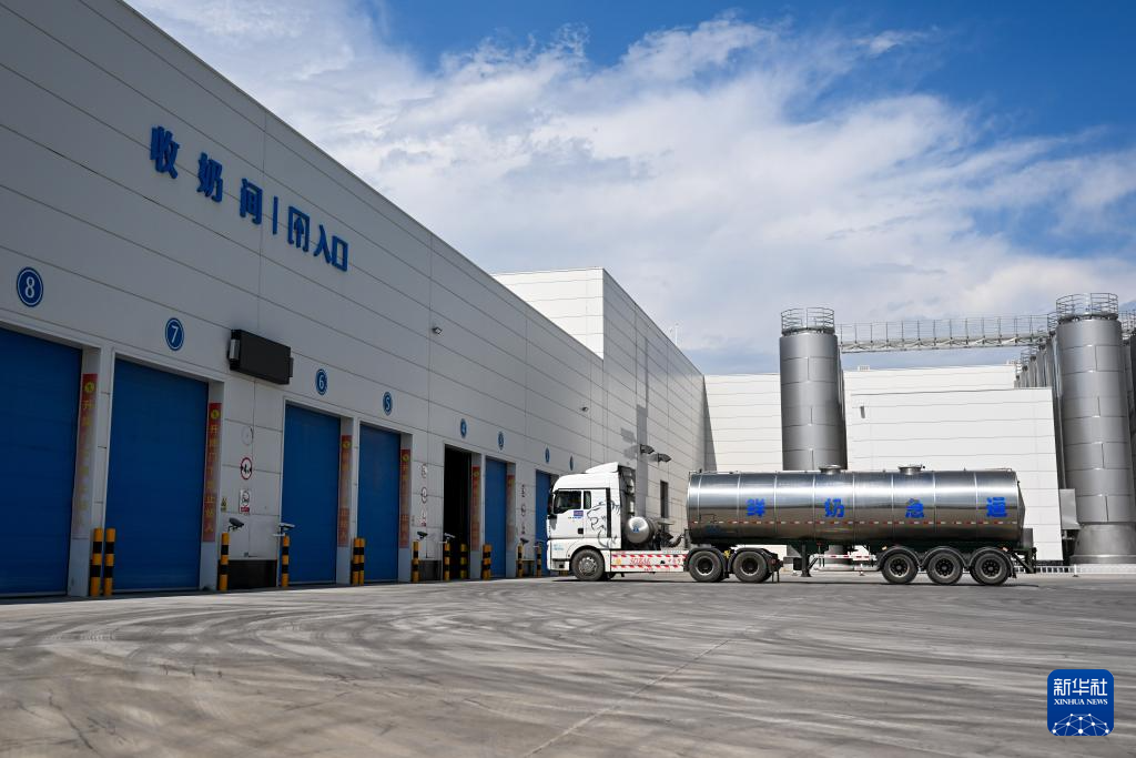 呼和浩特市伊利现代智慧健康谷液态奶全球智造标杆基地,一辆奶罐车驶入收奶车间(7月28日摄)。