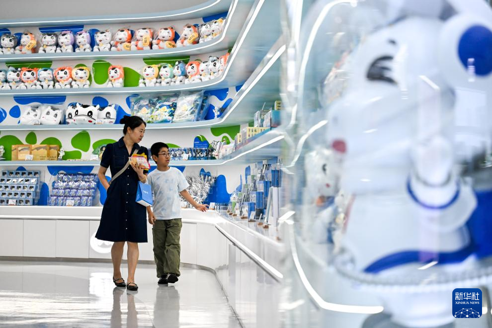 游客在呼和浩特市伊利现代智慧健康谷智造体验中心选购文创产品(7月28日摄)。