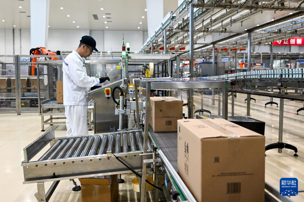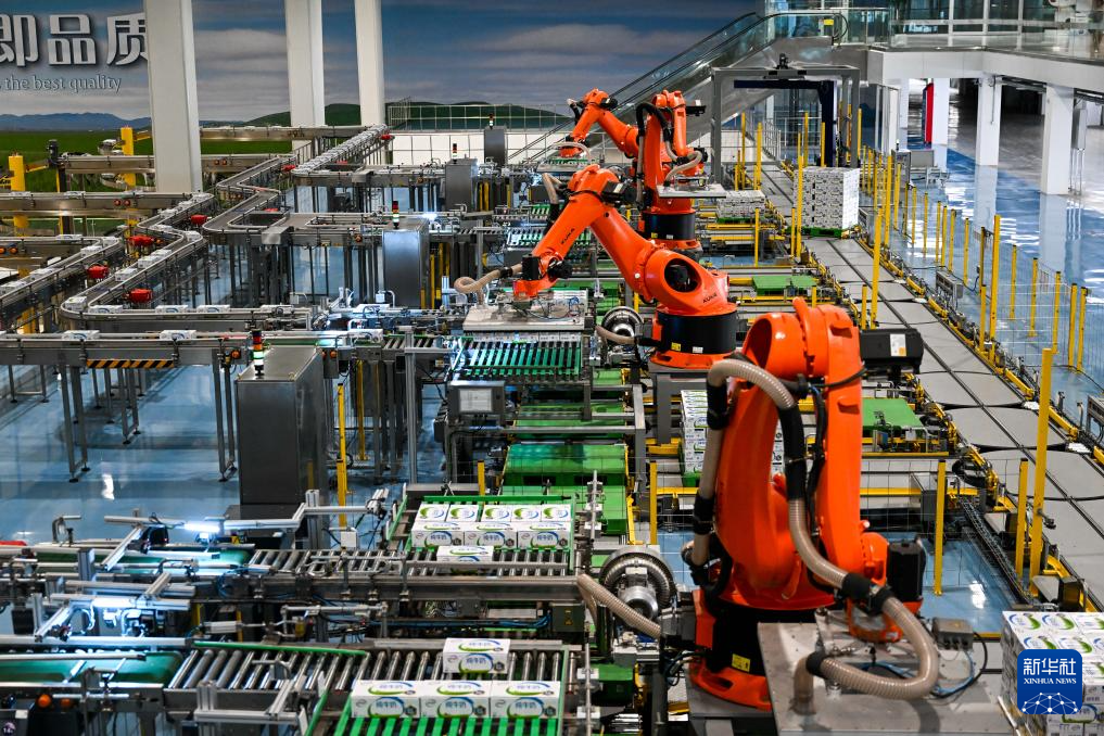 呼和浩特市伊利现代智慧健康谷液态奶全球智造标杆基地,机械臂在码放装箱的奶制品(7月28日摄)。